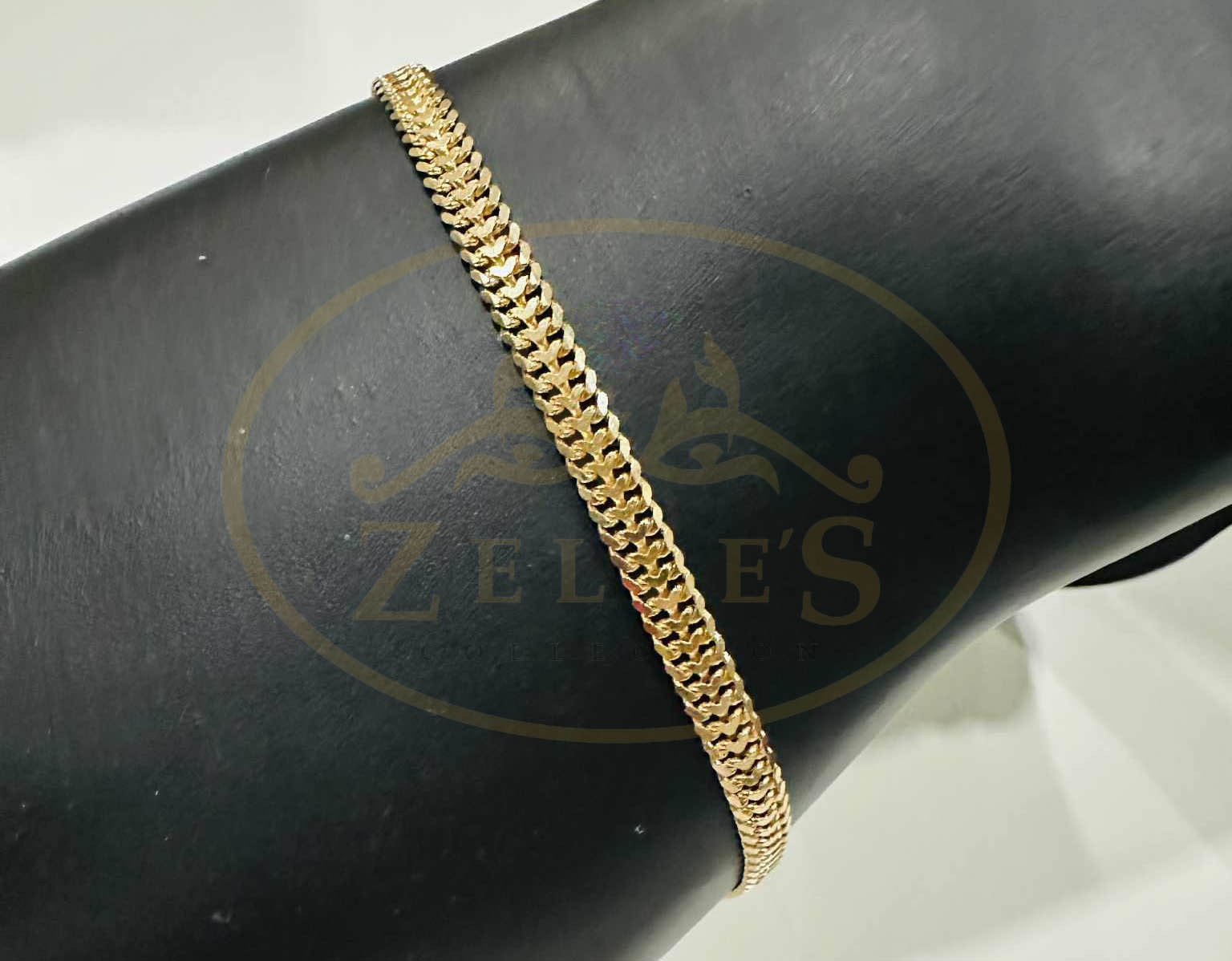 This dazzling 18K yellow gold bracelet features an intricate, shimmering flat link chain (known as Heartbiz). It measures 7.5 inches in length and weighs 5.73 grams. Its polished finish catches the light beautifully, making it an elegant and eye-catching piece perfect for daily wear or special occasions.