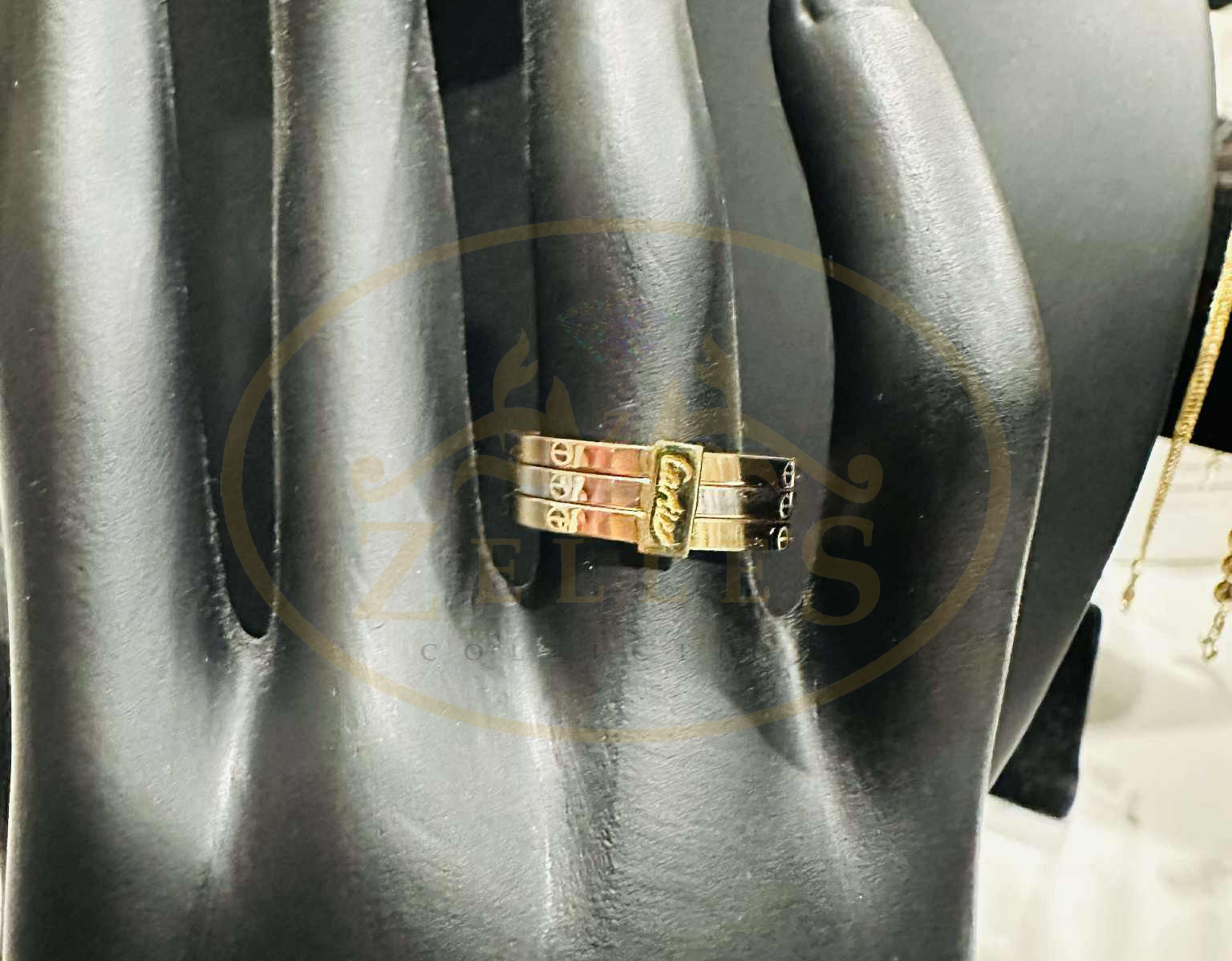 Each of the three bands is engraved with what appears to be a repeated stylized logo or pattern, giving the piece texture and a high-end designer feel. This rolling design is both comfortable and visually engaging.